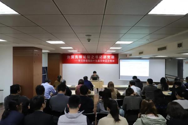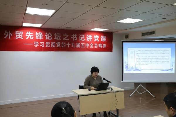 11月30日下午,外贸公司开展先锋论坛之书记讲党课系列活动,本次主题为“学习贯彻十九届五中全会精神”,由第二支部书记、轻纺&轻工事业部总经理潘慧萍讲授。