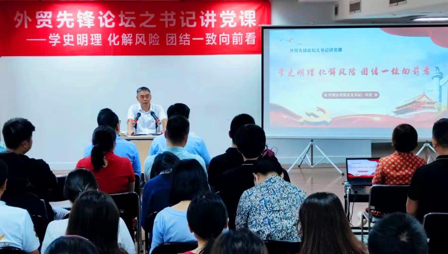 今年是中国共产党成立100周年。为学习贯彻习近平总书记在党史学习教育动员大会上发表的重要讲话,落实集团党史学习教育工作方案,进一步深入推进党史学习教育,8月31日下午,外贸公司党总支书记、董事长毕武为公司全体党员和中高层管理干部讲授“学史明理 化解风险 团结一致向前看”主题党课。