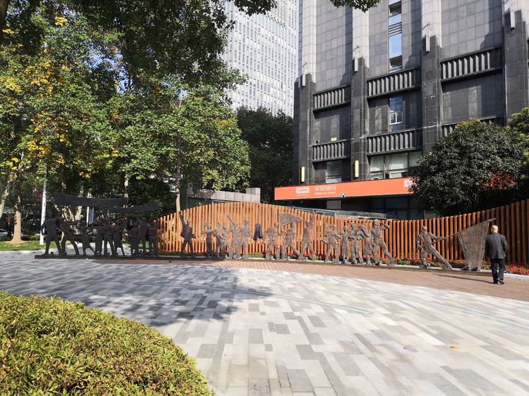 在距公司不远的长江路五二〇运动纪念广场入口处,有一座总体呈圆拱形的主题雕塑,上书“520学生运动纪念广场”。其作者为南大著名雕塑艺术家吴为山教授,设计灵感来自5、2、0这3个数字的弧形,寓意时光穿越之门、历史审视之门,雕塑上遍体的“伤痕”则展现了斗争的悲壮。走进穿越之门,就能看到广场的人物群雕,反映了当年中央大学学生走上街头反饥饿、反迫害、反内战的场景,地面灯带采用线条的形式,将历史事件以时间线为逻辑顺序,进行叙述,表现了当年波澜壮阔的历史。